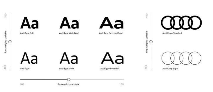 除了「可變」的奧迪環,設計團隊還設計開發了完整的動態印刷和排版結構,使品牌LOGO的表現力變得更加強大。為了適應靈活的奧迪環,奧迪品牌字體「Audi Type」同樣支持字體的粗細變化,讓數字設備的可讀性更加可靠。