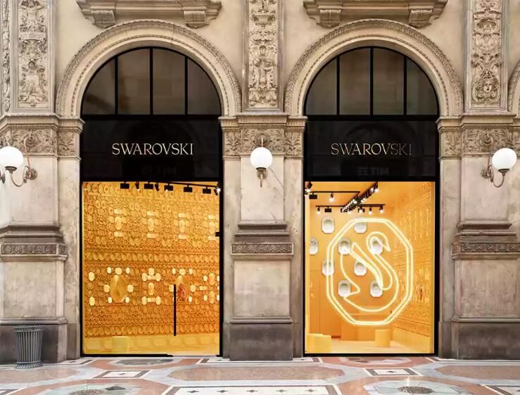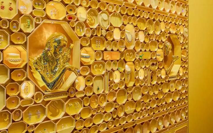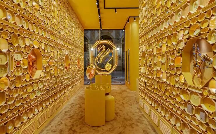 除了重新設計LOGO外,施華洛世奇還推出名為 「Instant Wonder」的門店。Instant Wonder 門店裝潢依然以八角形為靈感,如被金黃色「晶體」包覆的墻面,緊密排列的金黃色結構實為展示首飾、腕表、家居飾品及配件的櫥窗。從壁面「延伸」出的金屬雕塑,則成了演繹 Giovanna Engelbert 首發作品 Collection One的模特兒。